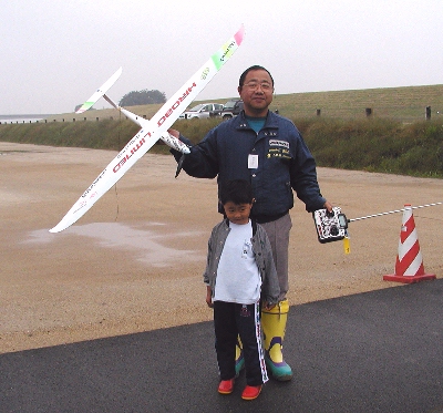 アピール飛行の部に参加、旧ルールのF5B機をお手軽ホットライナーにセットしました。本日の入力は350W程度ですが、競技仕様ですと2000Wも入力するのだそうで、そんなものは扱い切れませんので、やさしく飛ばします。